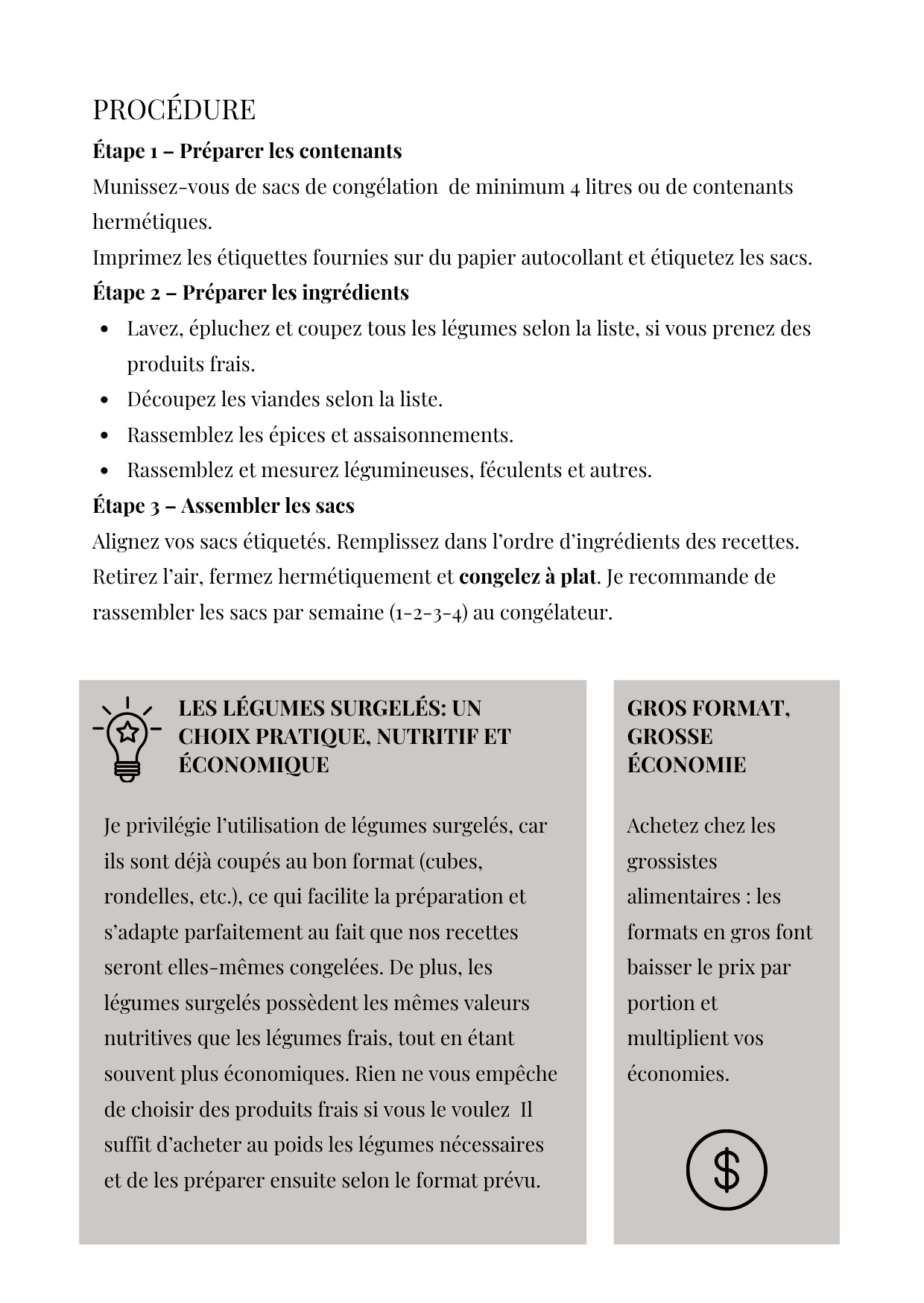 Organisez vos repas du soir sans stress grâce à une méthode simple : une après-midi de cuisine aux deux mois ! Ce guide rassemble 62 recettes faciles pour la mijoteuse, avec instructions claires et liste d'épicerie complète. Gagnez du temps, réduisez vos dépenses et profitez d’une organisation culinaire optimale !